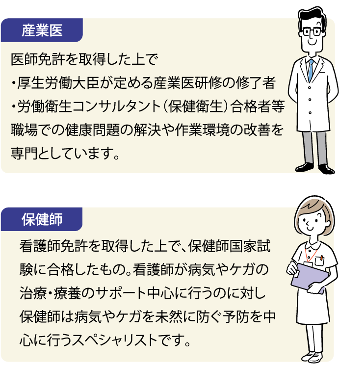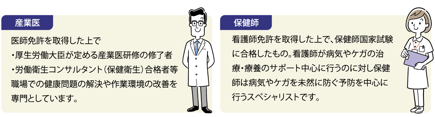 産業医や産業保健師など、労働者の健康と安全を促進し、労働環境に関する健康リスクを管理する専門家です。