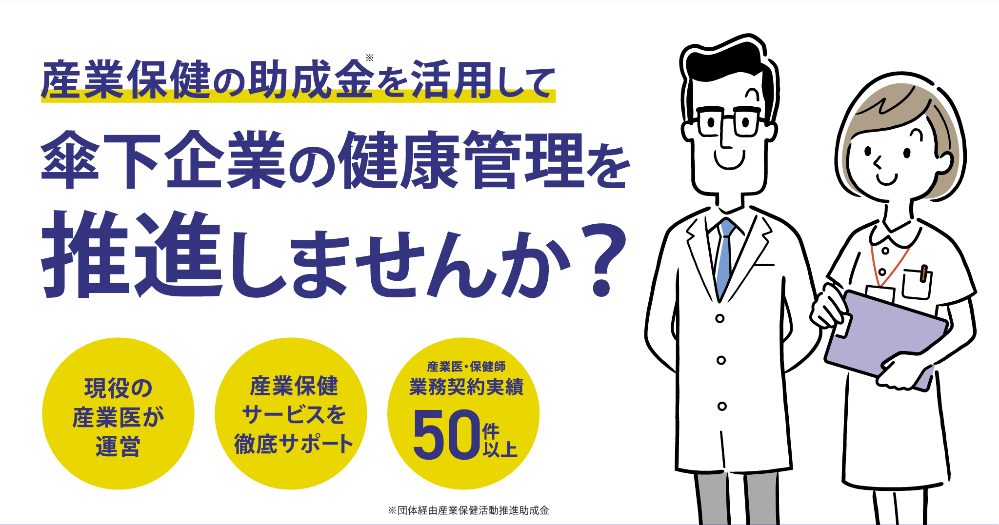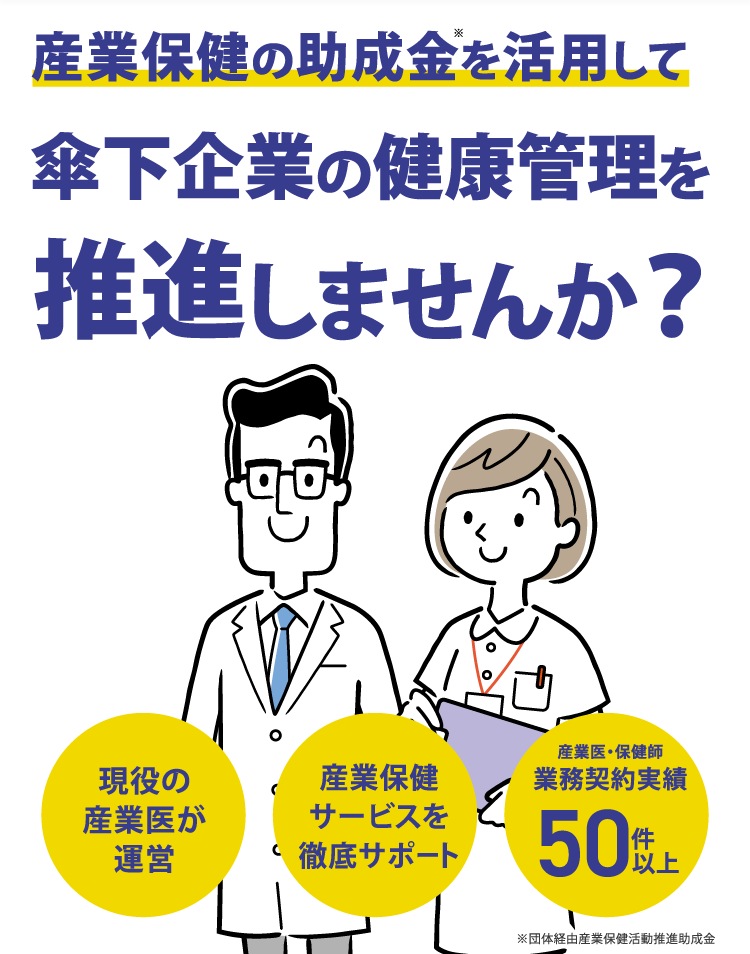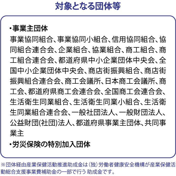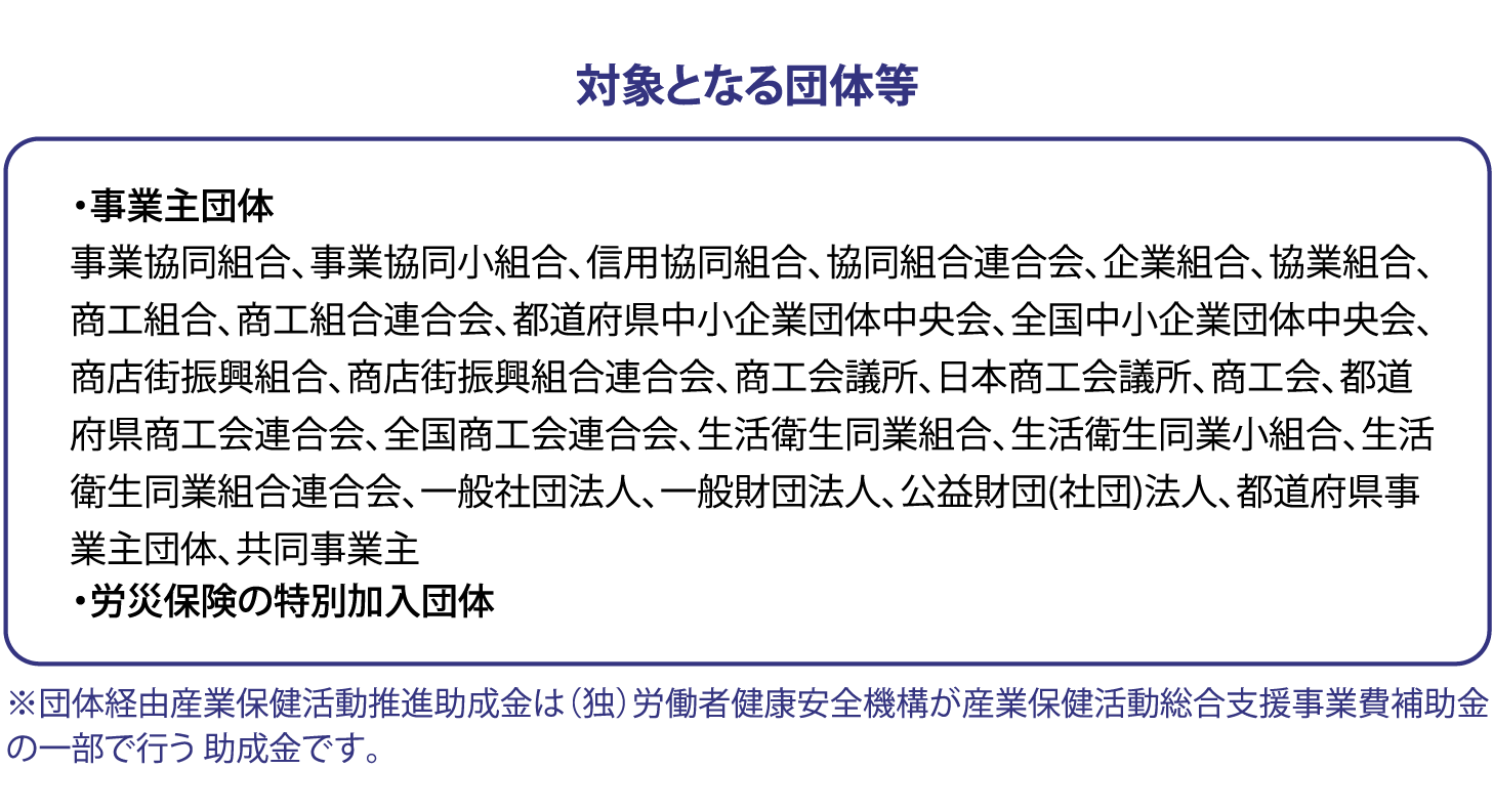 事業者団体が傘下の中小企業に対し、産業保健サービス を提供した際に、その費用の一部を助成するものです。