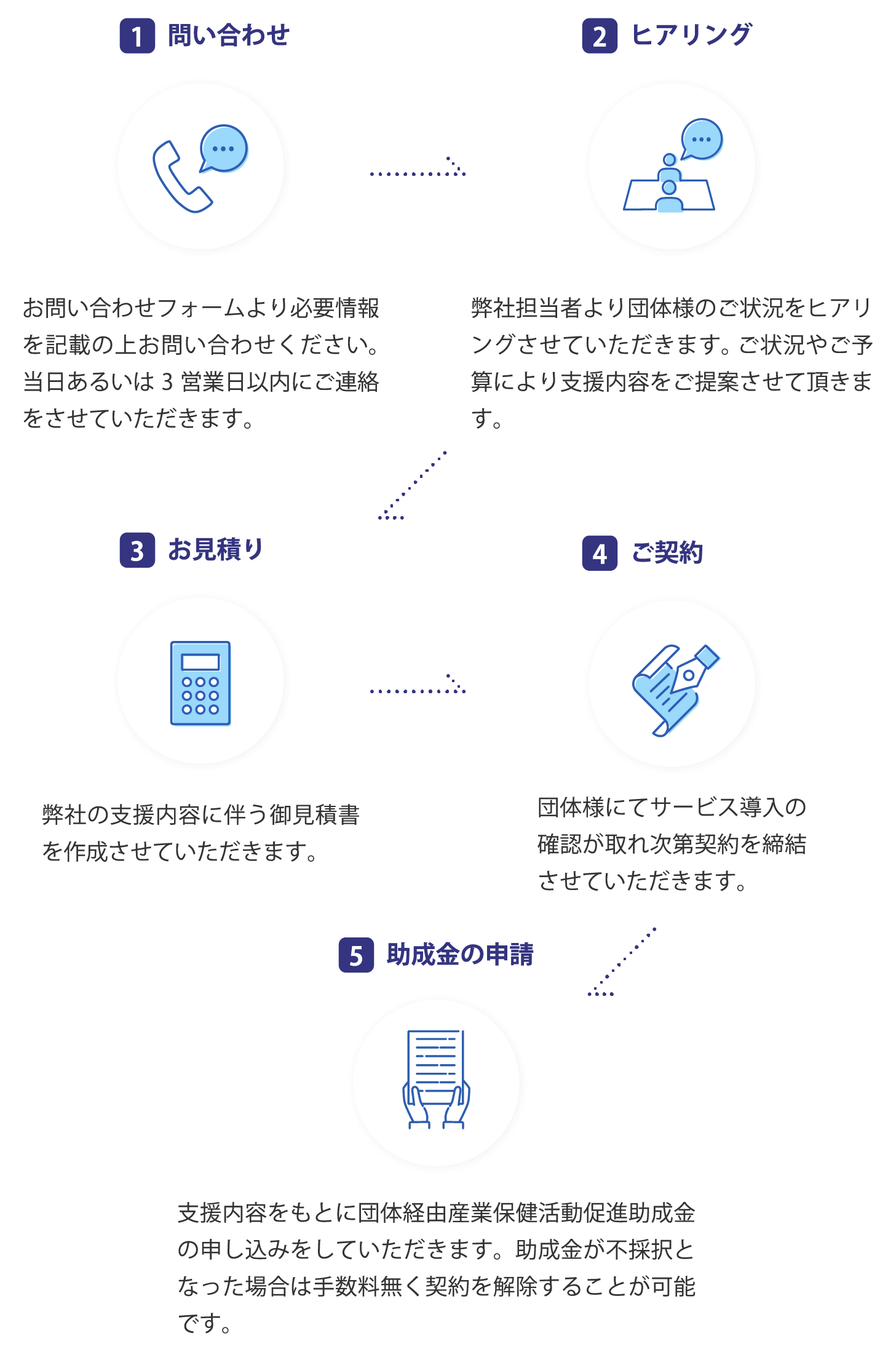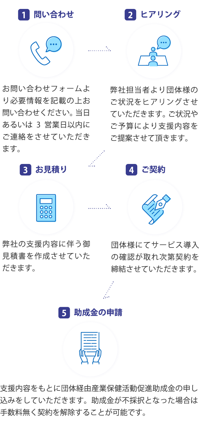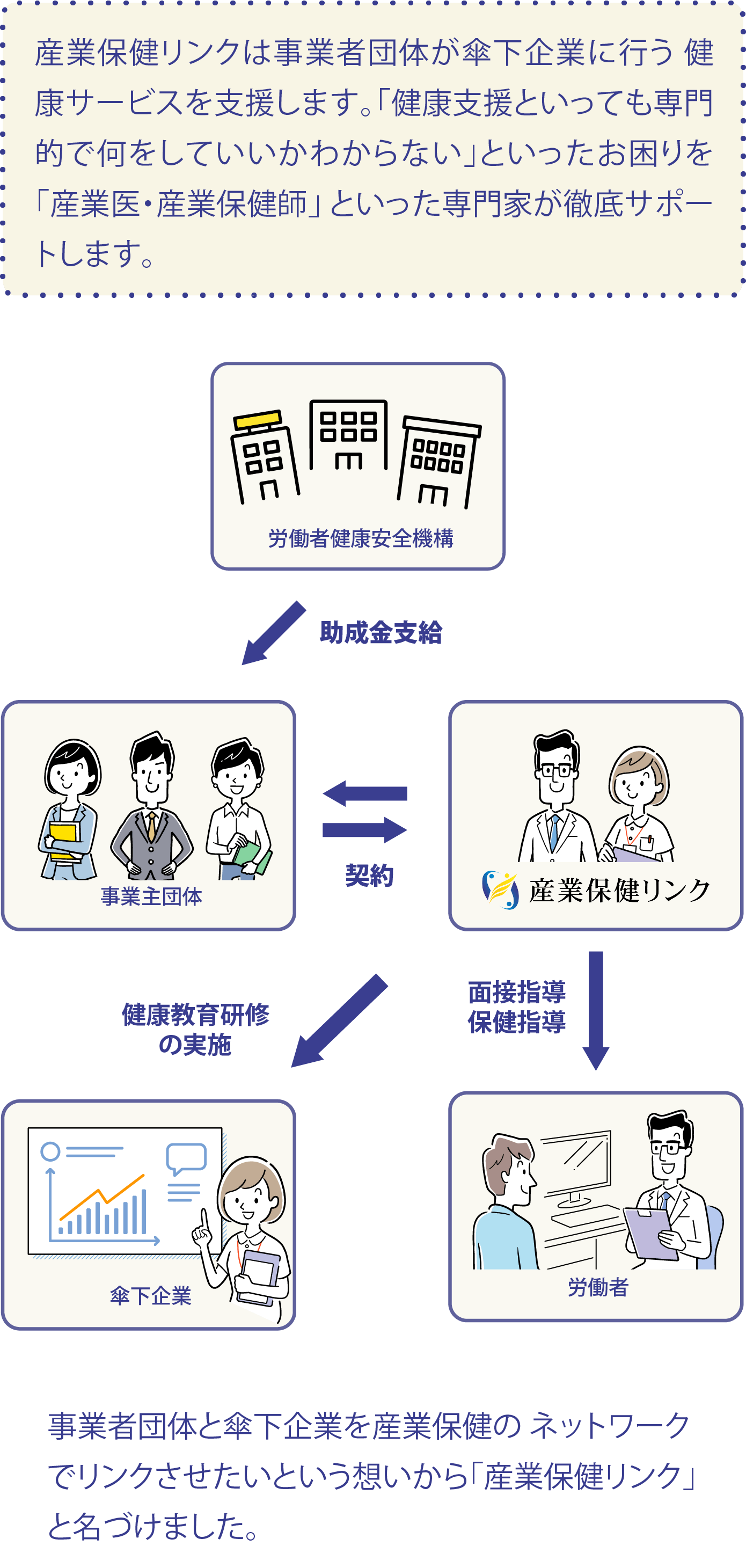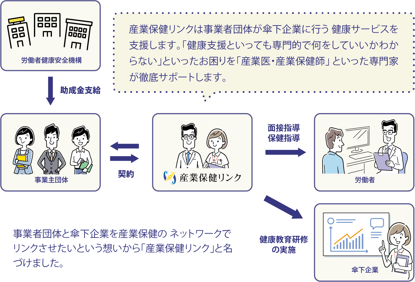 こうした状況を解決するため、事業者団体が傘下事業者団体をサポートする考え方が広まっています。産業保健リンクでは事業者団体が活用できる補助金を利用し、事業者団体が傘下団体に行う健康支援をサポートします。